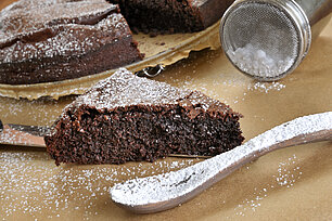 6. Den Kuchen in der Form auskühlen lassen, aus der Form lösen, mit dem restlichen Puderzucker bestreuen und nach Belieben mit Schokoladen- oder Vanillesoße servieren. Für die Schokoladensoße 50 g Bitterkuvertüre grob hacken und im Wasserbad schmelzen. 200 ml Sahne mit 1 EL Zucker und 1 EL Kakaopulver aufkochen. Die flüssige Kuvertüre unter ständigem Rühren einlaufen lassen.
